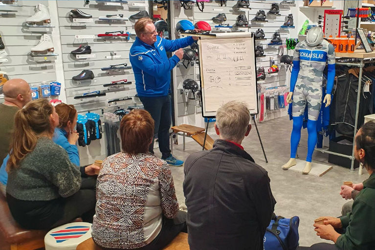 Een groep van 12 personen werd op 18 november door Jan, Lars en Michel, met chocolademelk en al, verwelkomd bij Schaatslab in Santpoort-Noord.