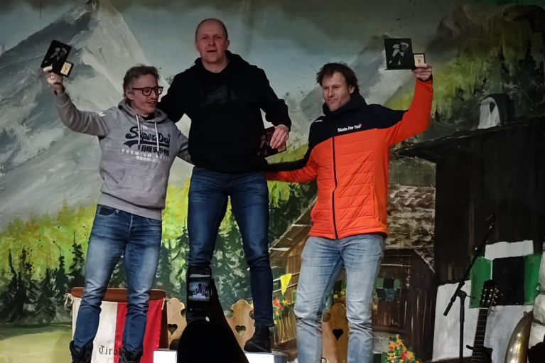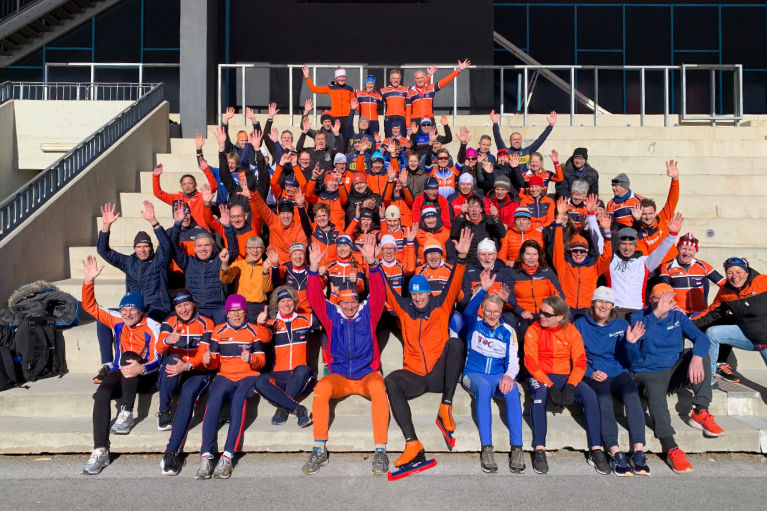 De Olympische arena Tivoli in Innsbruck is een enorm complex waar binnen ook aan ijshockey en kunstrijden wordt gedaan. De 400m  ijspiste zelf is niet overdekt en dat was zaterdag fijn in een dun zonnetje maar zondag ouderwets door de sneeuw rijden. Vrijdagmiddag was er eerst een ‘Team Netherlands’-foto en later die middag een ontvangst-bijeenkomst met snacks en drankjes en hadden de deelnemers een dikke informatiemap gekregen. Het is altijd weer leuk om schaatsers te ontmoeten die je al vele jaren kent van eerdere WK’s en andere Internationale Masterwedstrijden.