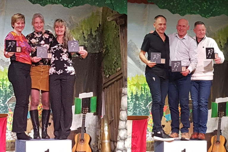 Om 19.00 u werd iedereen verwacht in de Alpensaal an der Messe (Expo). Daar wachtte ons een Tiroler avond, afgewisseld met eten, een prijsuitreiking en speeches. Verassend was dat er drie oud-Olympia deelnemers -die thans nog in de Masters rijden- op het podium werden geroepen voor een bijzonder applaus. Bruno Tonioli (1943) -O.S. 1976- tijdgenoot van Maurizio Marchetto (huidige coach van de Italiaanse ploeg), Gaetan Boucher (1958) -O.S. 1984- goud op de 1000m en 1500m.