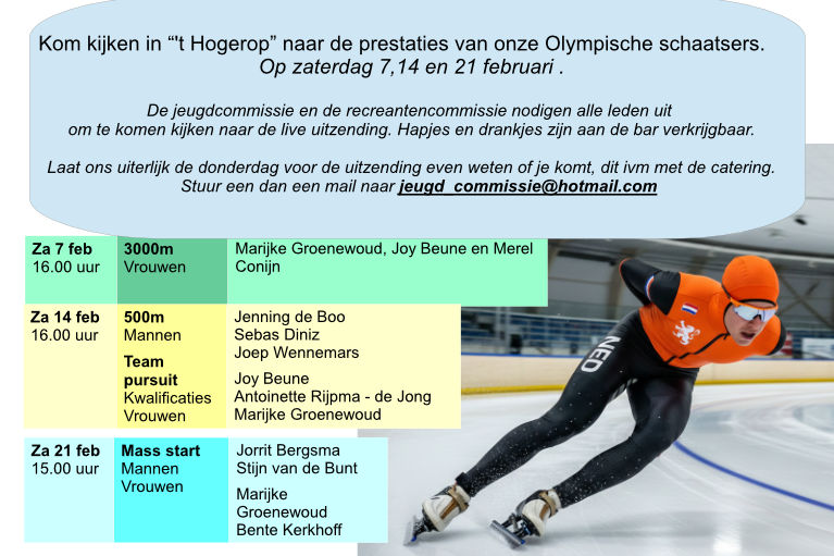 De Olympische Winterspelen komen er aan en dat vieren wij bij onze club! De jeugdcommissie en recreantencommissie slaan de handen ineen en nodigen alle leden uit om samen naar de prestaties van onze Olympische schaatsers te kijken.