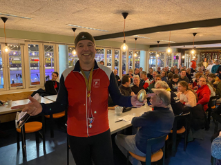 Vervolgens was er een prijs voor de persoon die de meeste clubgenoten had geronseld. Meestal is dat een train(st)er. Dit keer echter niet. Nu ging het om een man die niet alleen veel schaatsers, maar ook nog eens een handvol handklokkers had aangeleverd. Allen uit de Collalbo-ruif en dus ontving de veelzijdige John Komen, de eenmalig uit te reiken IJSBAAN HAARLEM-en-OMSTREKEN-BASELGA-COLLALBO-IJSVREDEPRIJS !